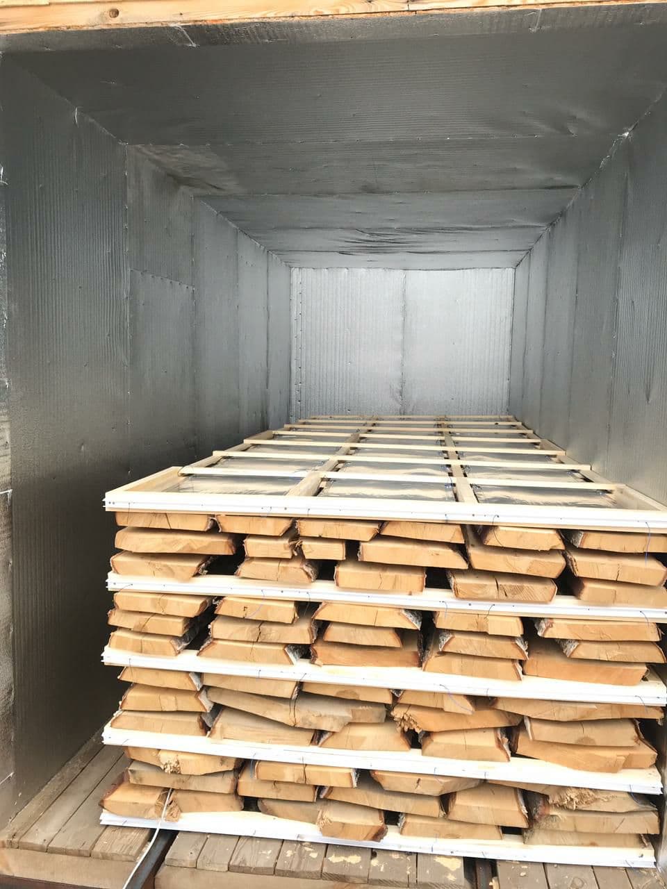 УКЛС передаёт тепловую энергию непосредственно в древесину, а не нагревает воздух вокруг материала. Это позволяет достичь экономии до 50% электроэнергии по сравнению с традиционными методами и обеспечивает качественную сушку с одинаковой конечной влажностью в любом месте штабеля.