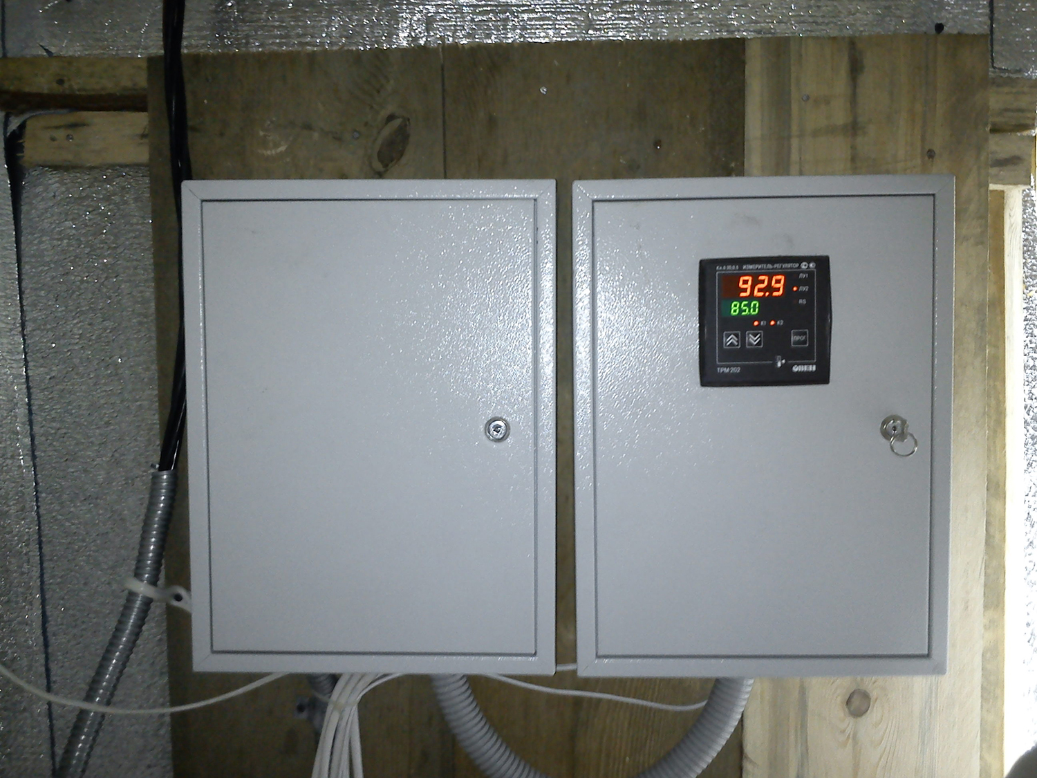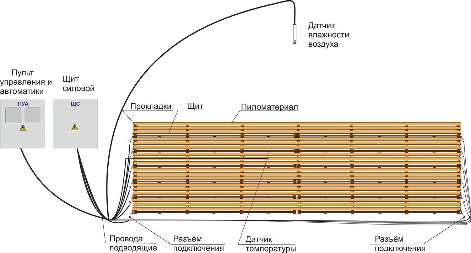 - К ПУА подключаются два датчика: датчик температуры для контроля прогрева тела древесины и датчик влажности воздуха в помещении сушки.